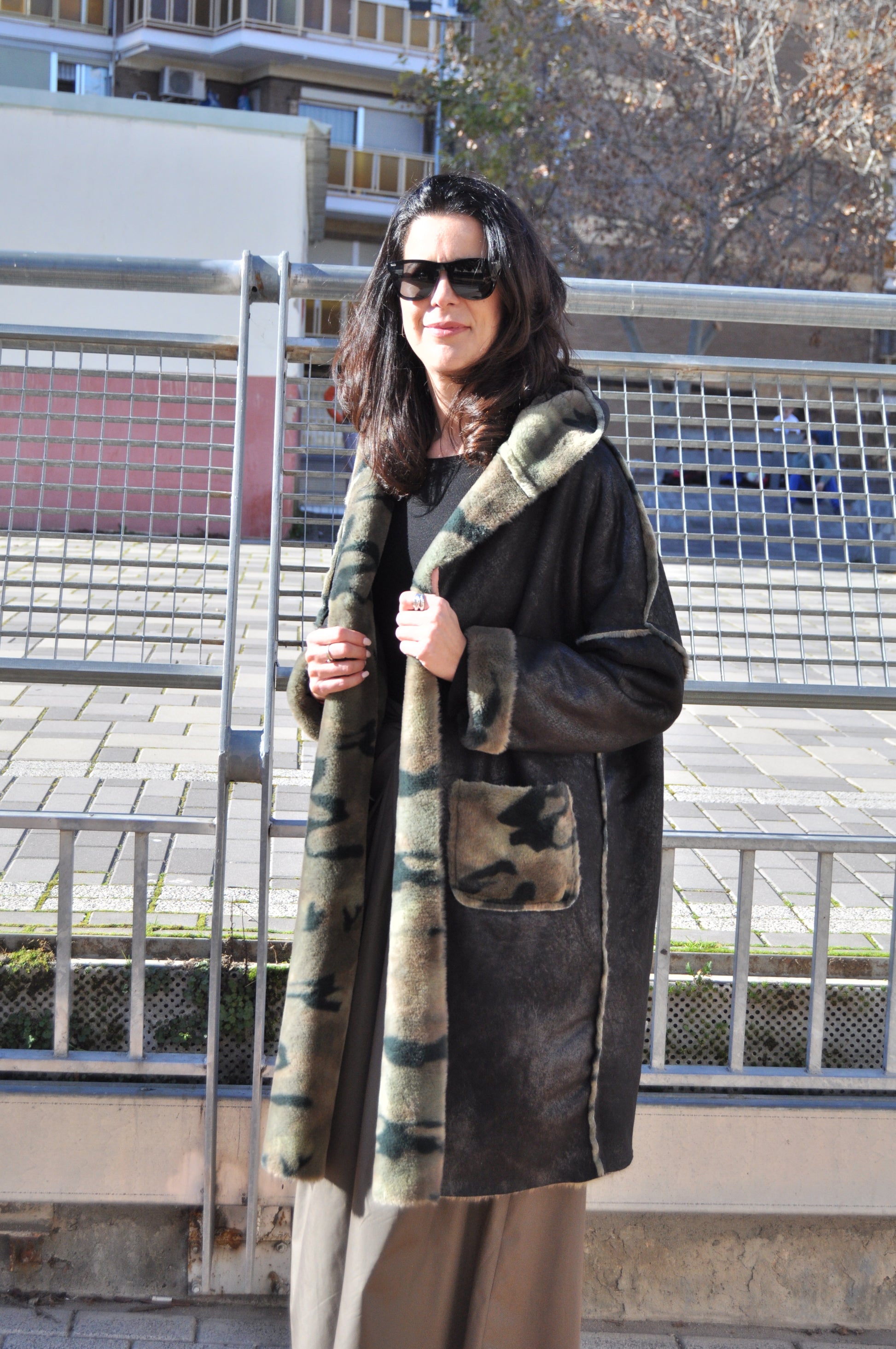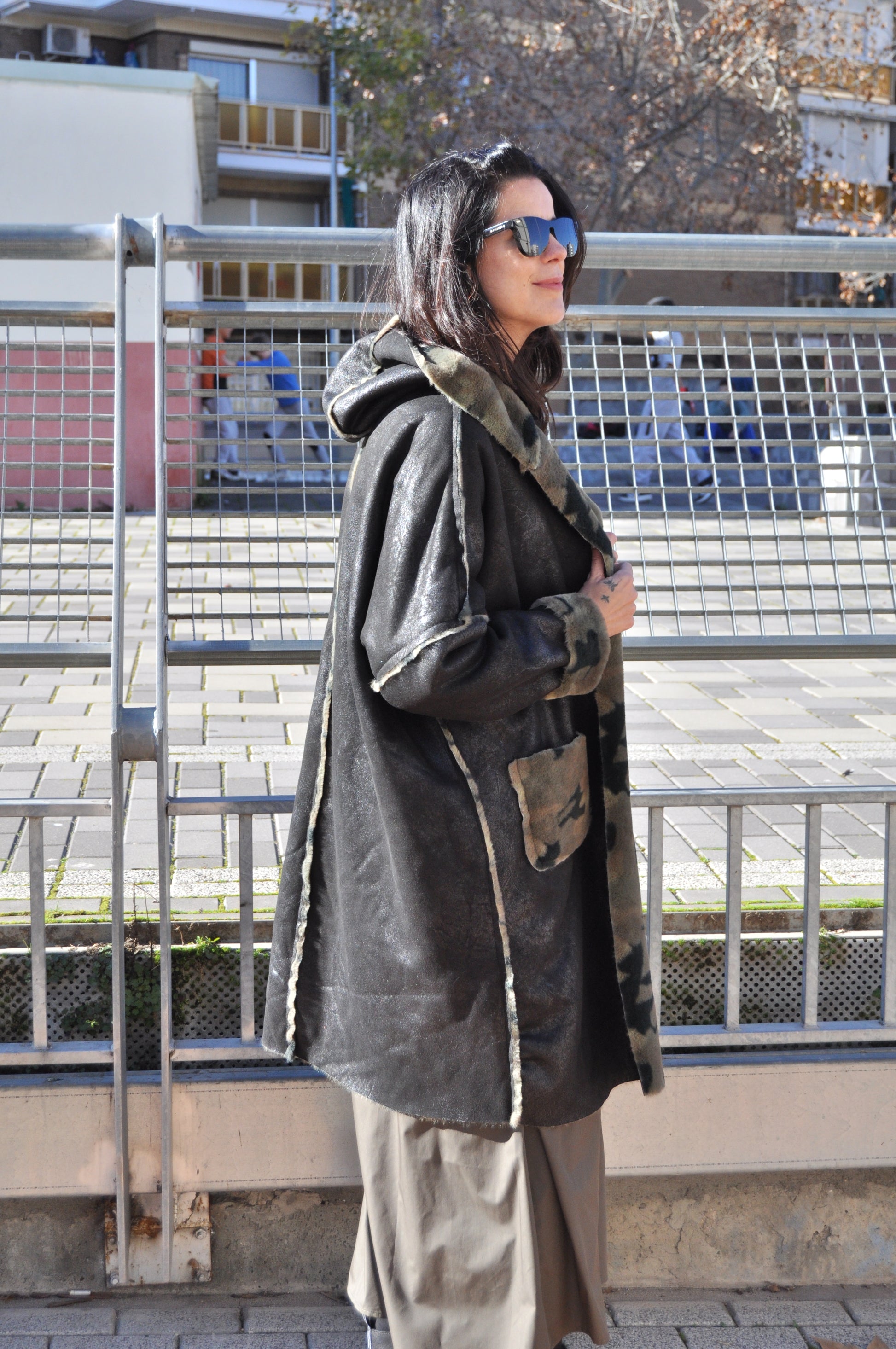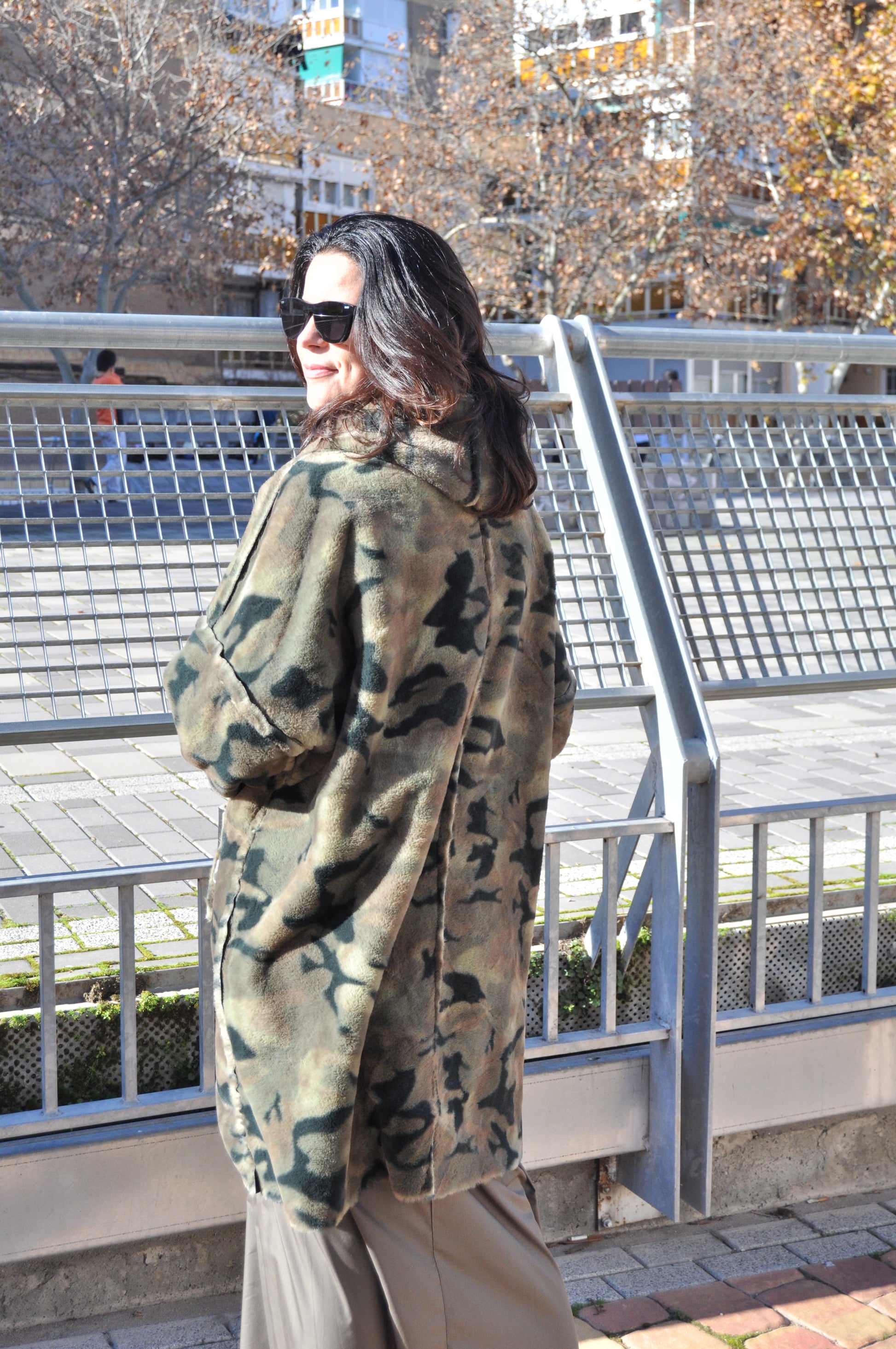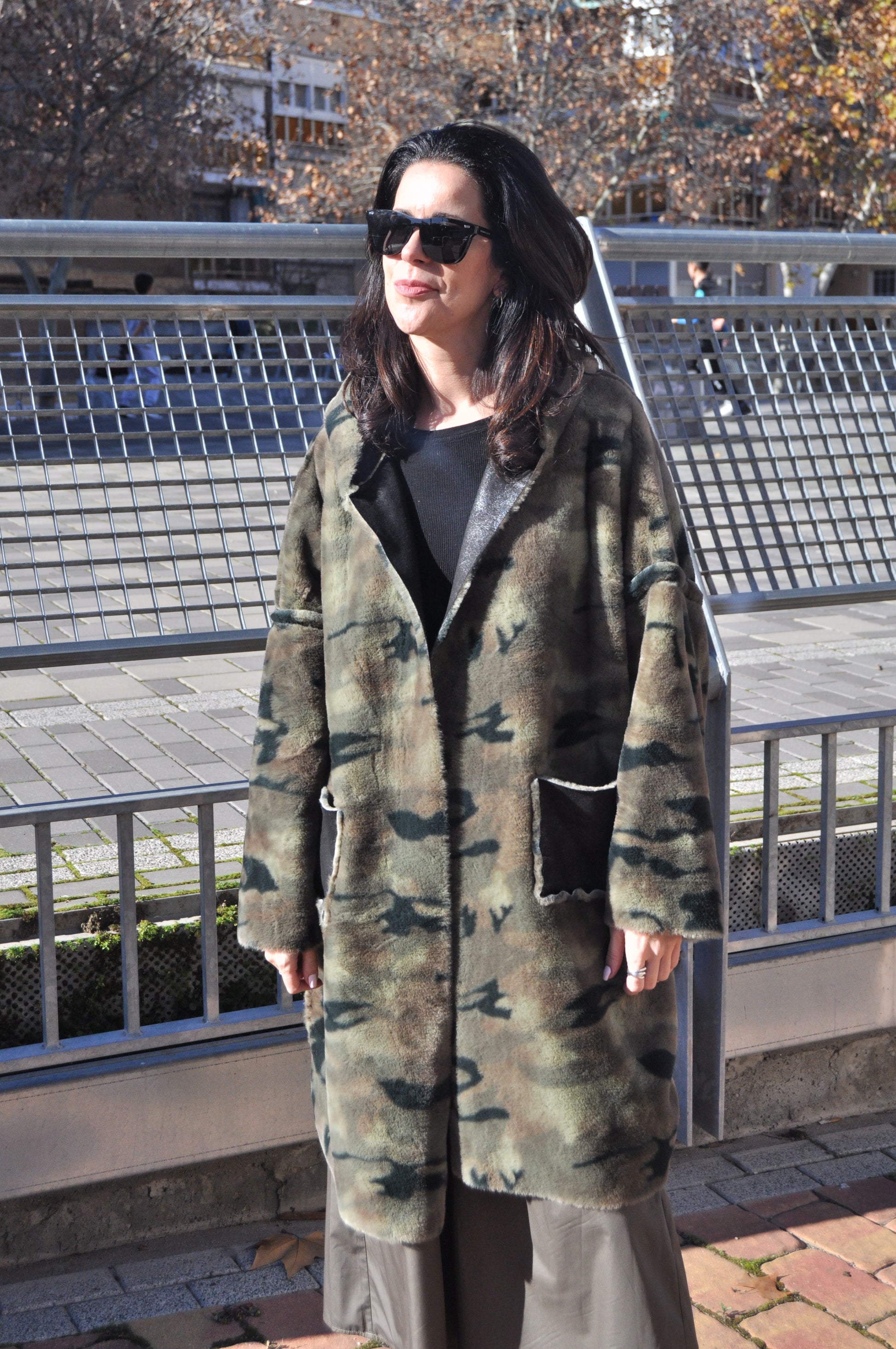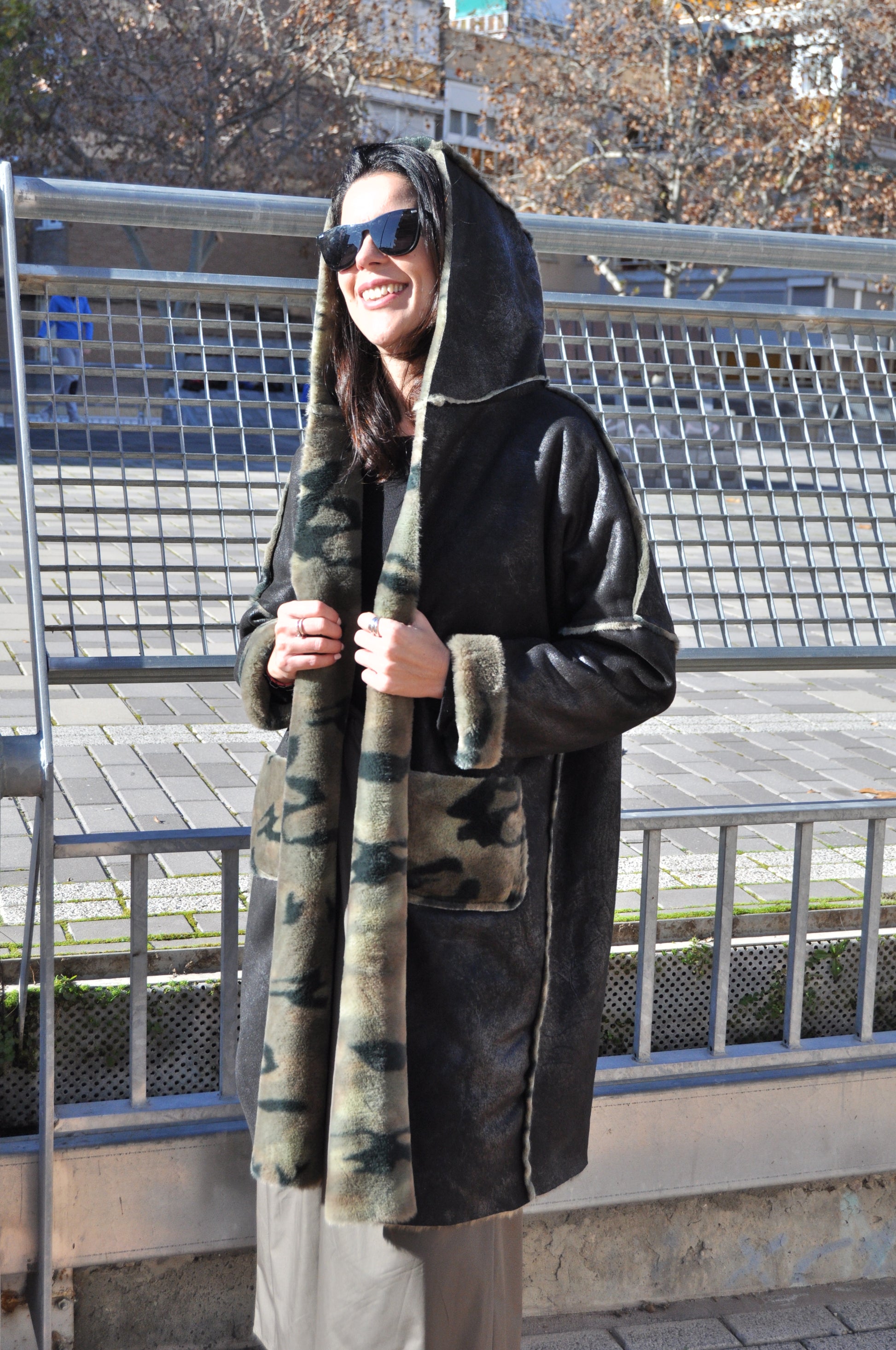 Abrigo reversible de peluche con estampado de camuflaje, con bolsillos y capucha. Piel sintética.