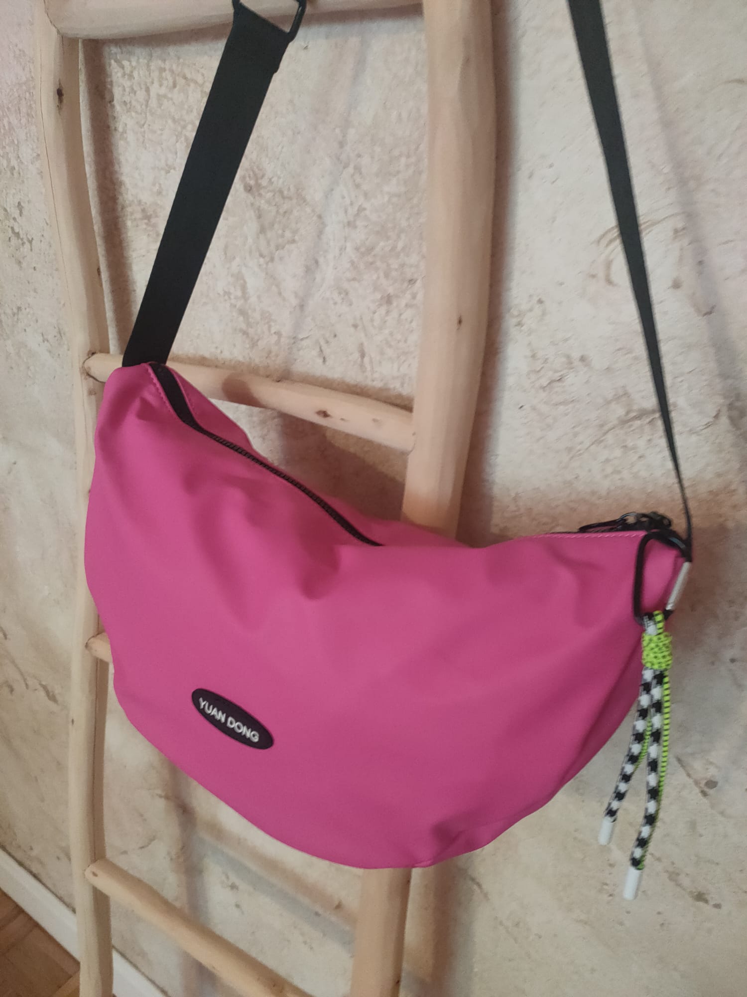 Bolso/bandolera impermeable en color fucsia y cierre de cremallera. Contiene pequeño bolsillo interior y otro trasero.