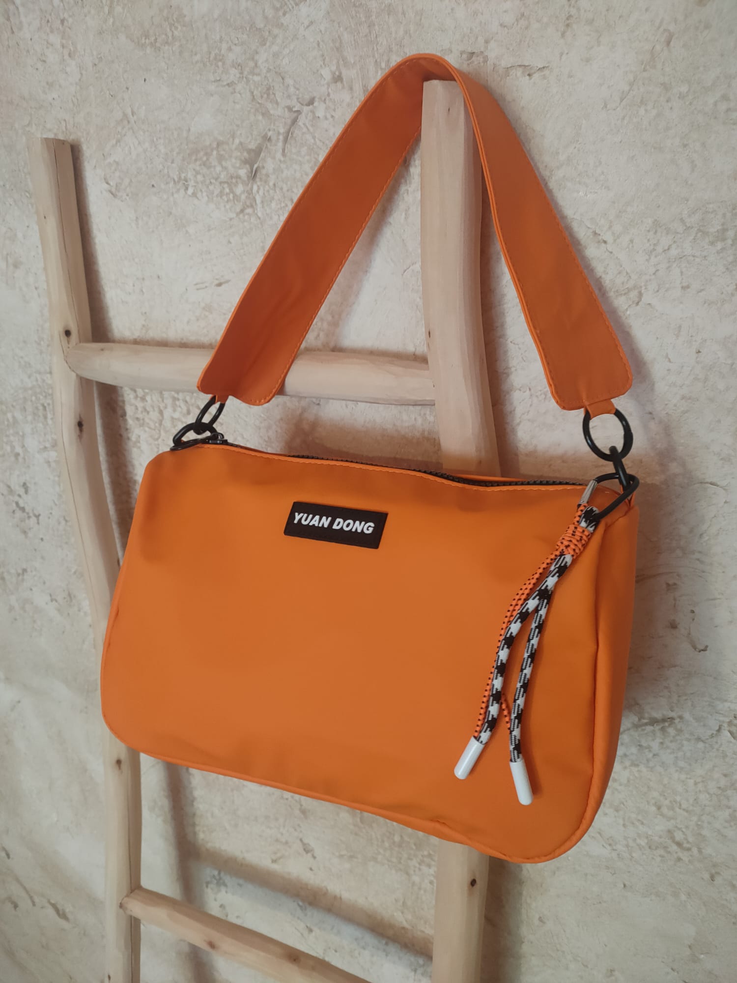Bolso/bandolera impermeable en color naranja y cierre de cremallera. Contiene pequeño bolsillo interior y bolsillo trasero. Además de contar con doble asa, una de mano y otra adaptable para convertirlo en bandolera.
