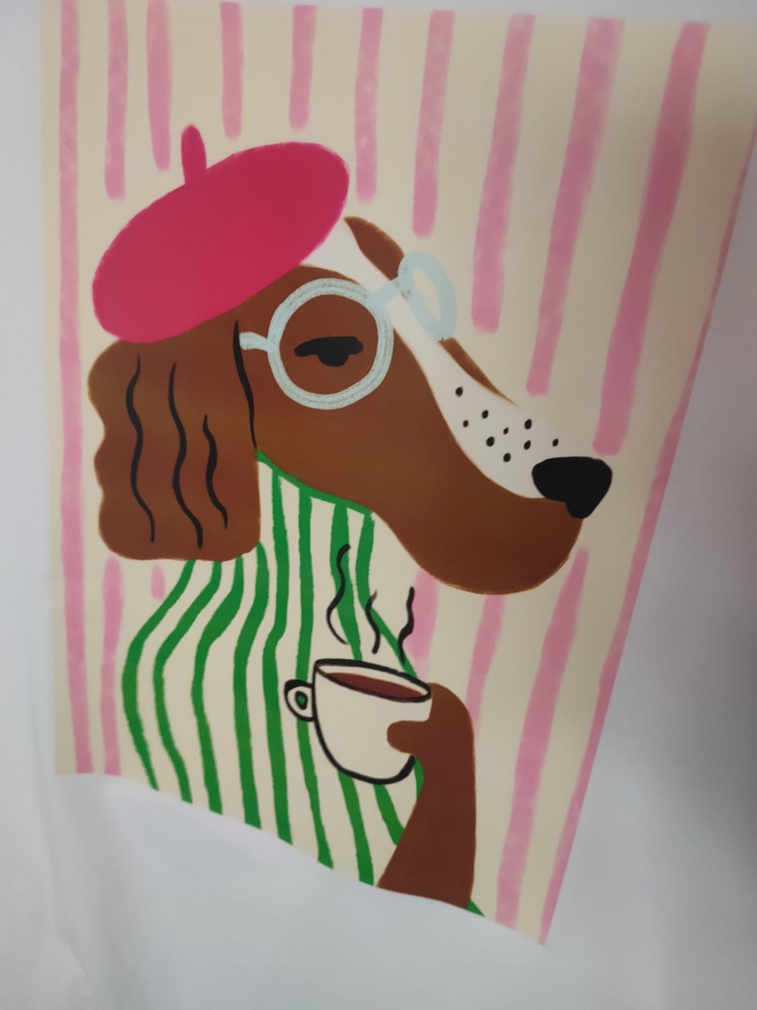 Camiseta de algodón con estampado en tonos rosa y verde de perrito Cocker. Tejido: 95% algodón, 5% elastano.