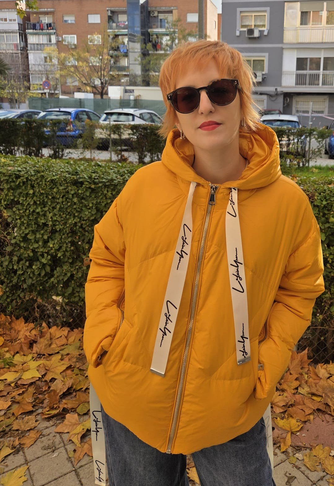Chaqueta plumífero con capucha, ligeramente más larga en la parte trasera. Cierre de cremallera y detalle de cremallera en los puños. Color Amarillo.