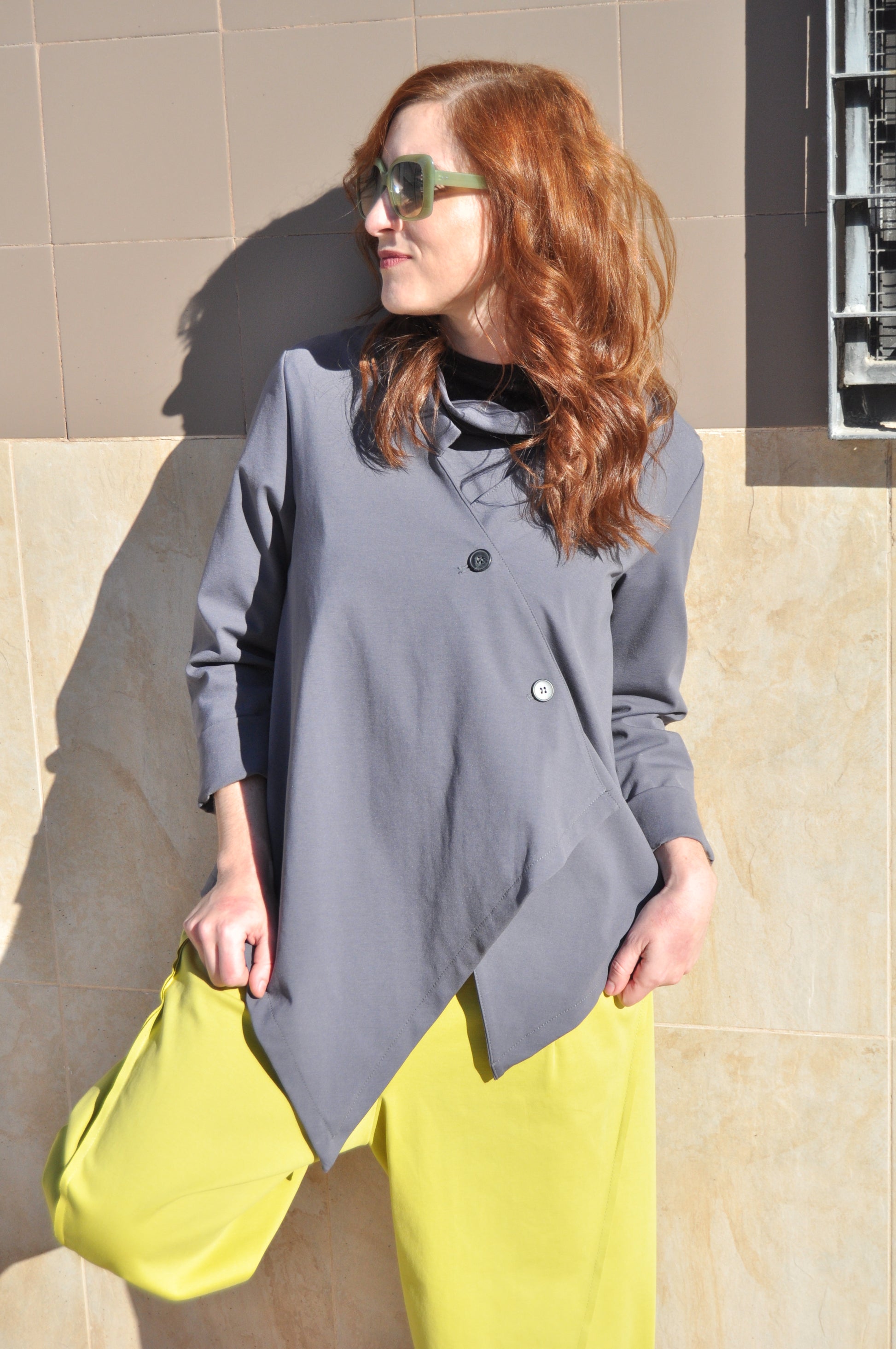 Chaqueta de botonadura asimétrica. Confeccionada en un fantástico tejido de punto roma color gris. Una manera cómoda de marcar estilo.