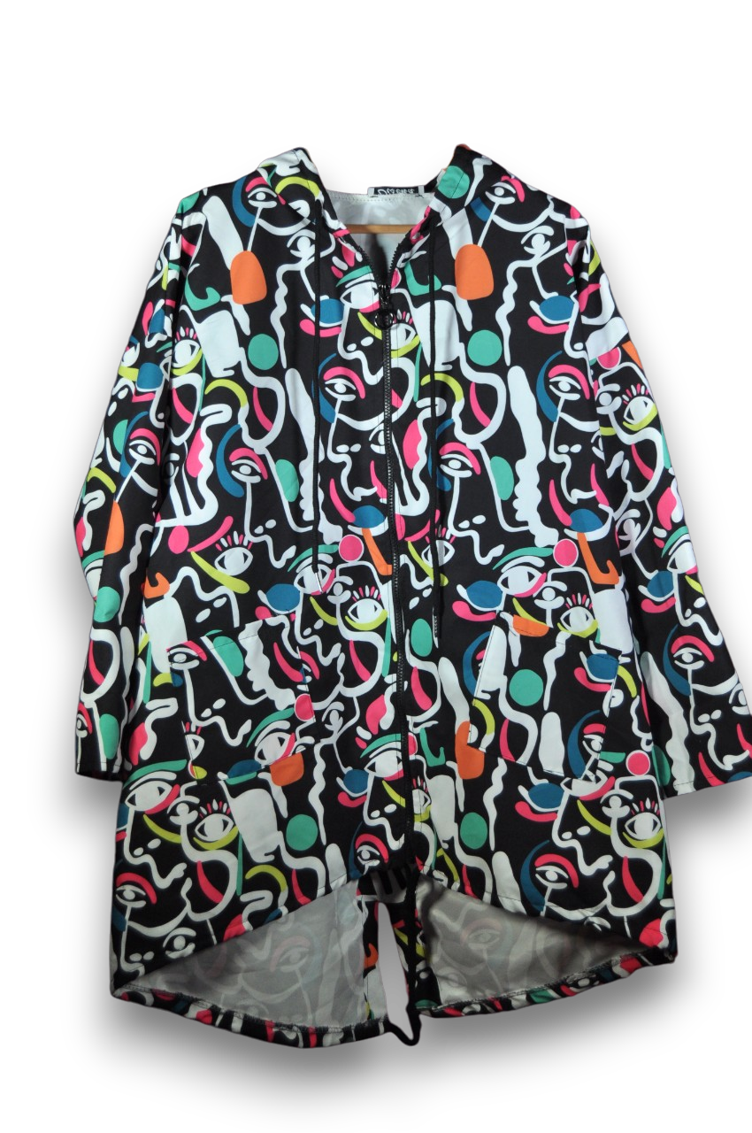 Chubasquero con capucha elaborado en un original y colorido estampado.