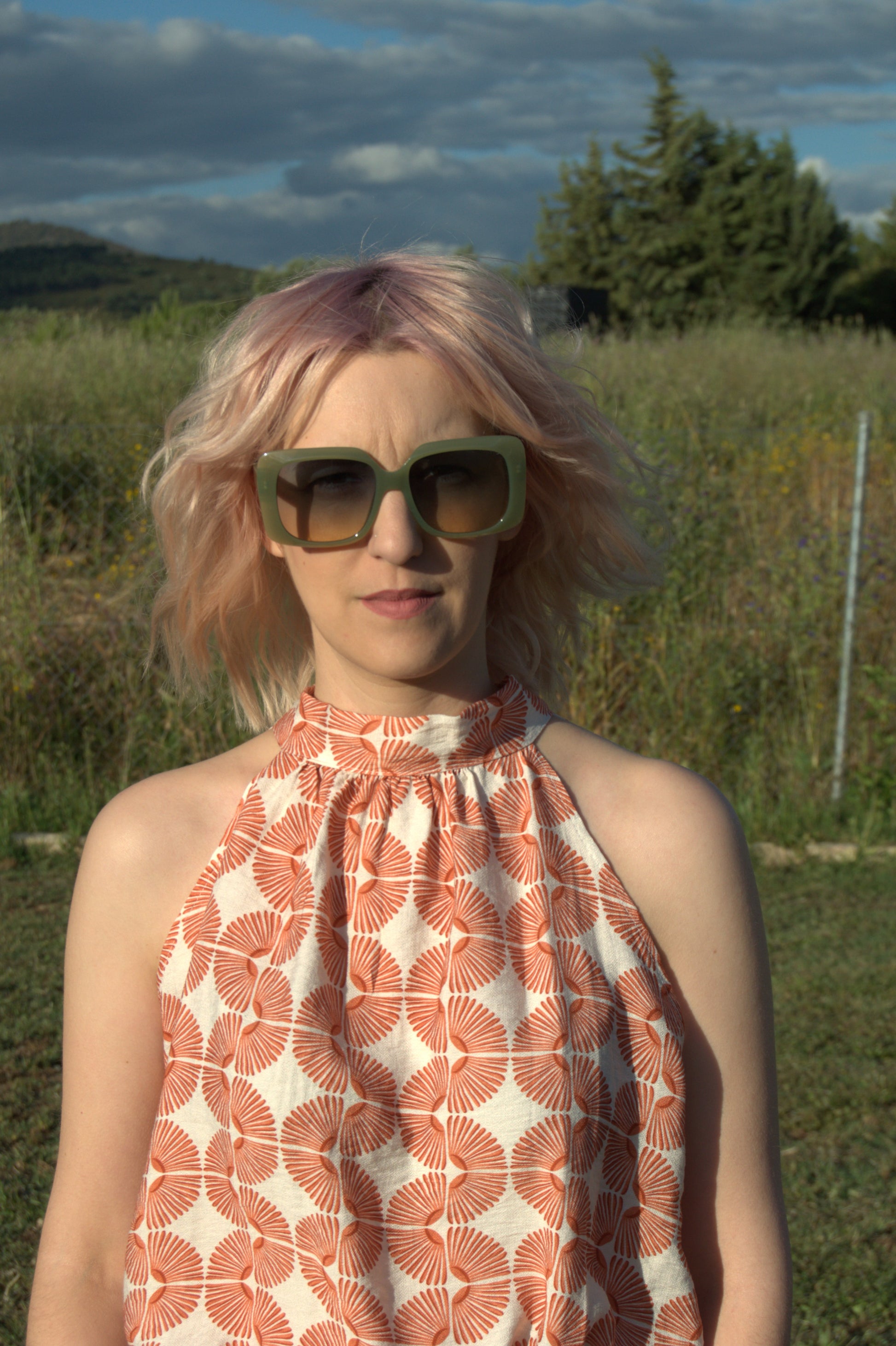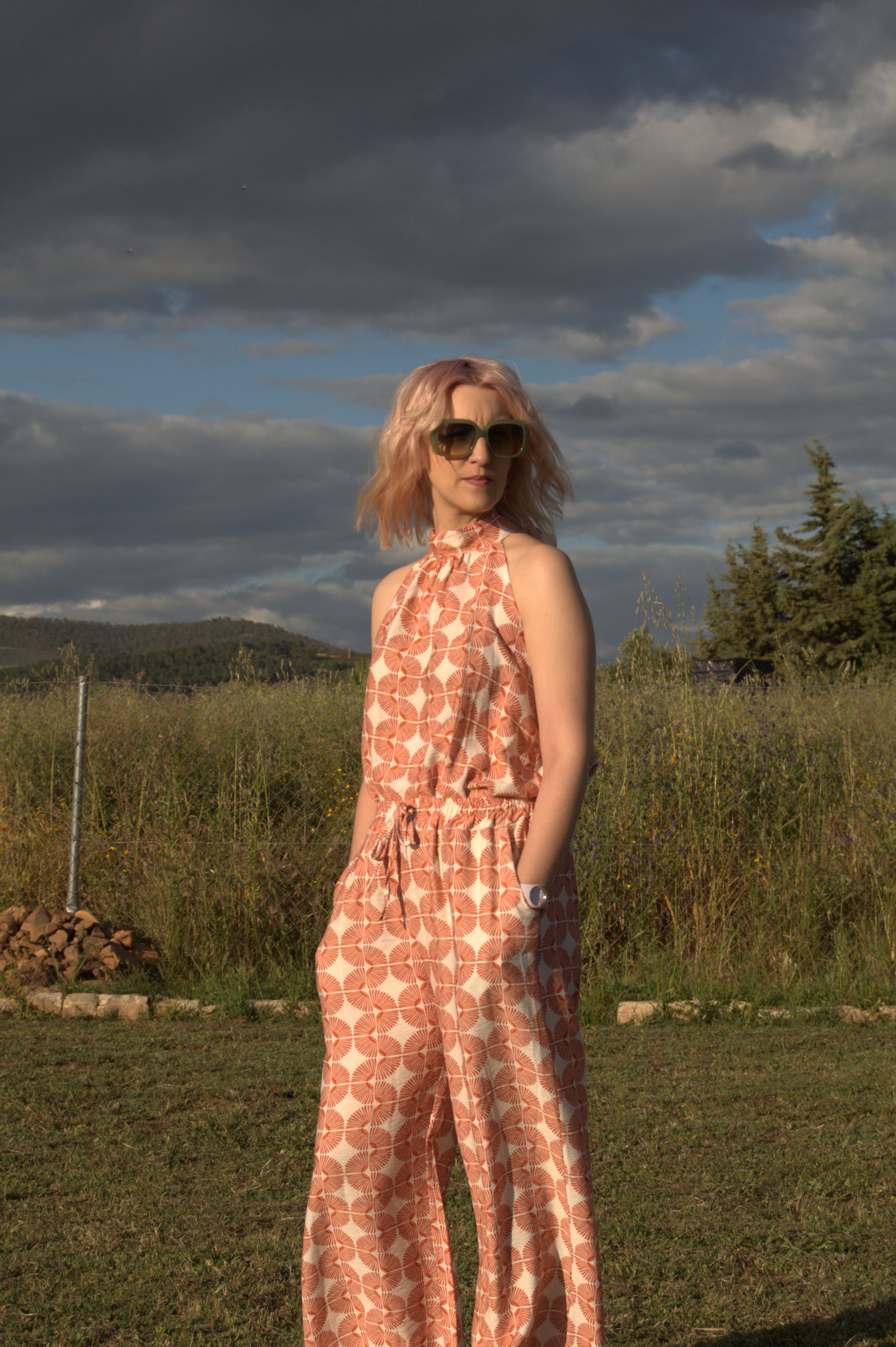 Conjunto pantalón y top de cuello halter con estampado geométrico en tonos naranjas. Cintura elástica.