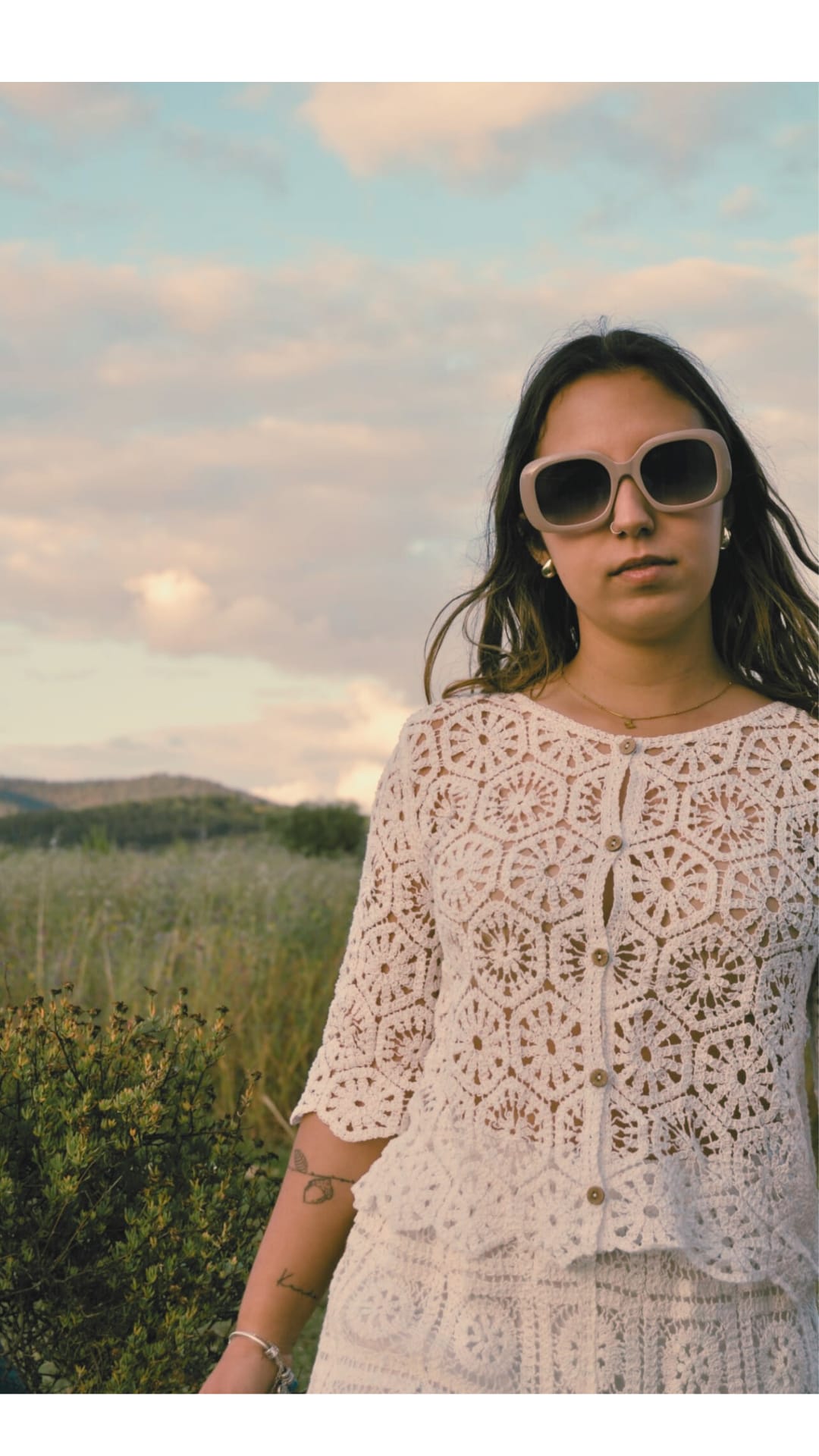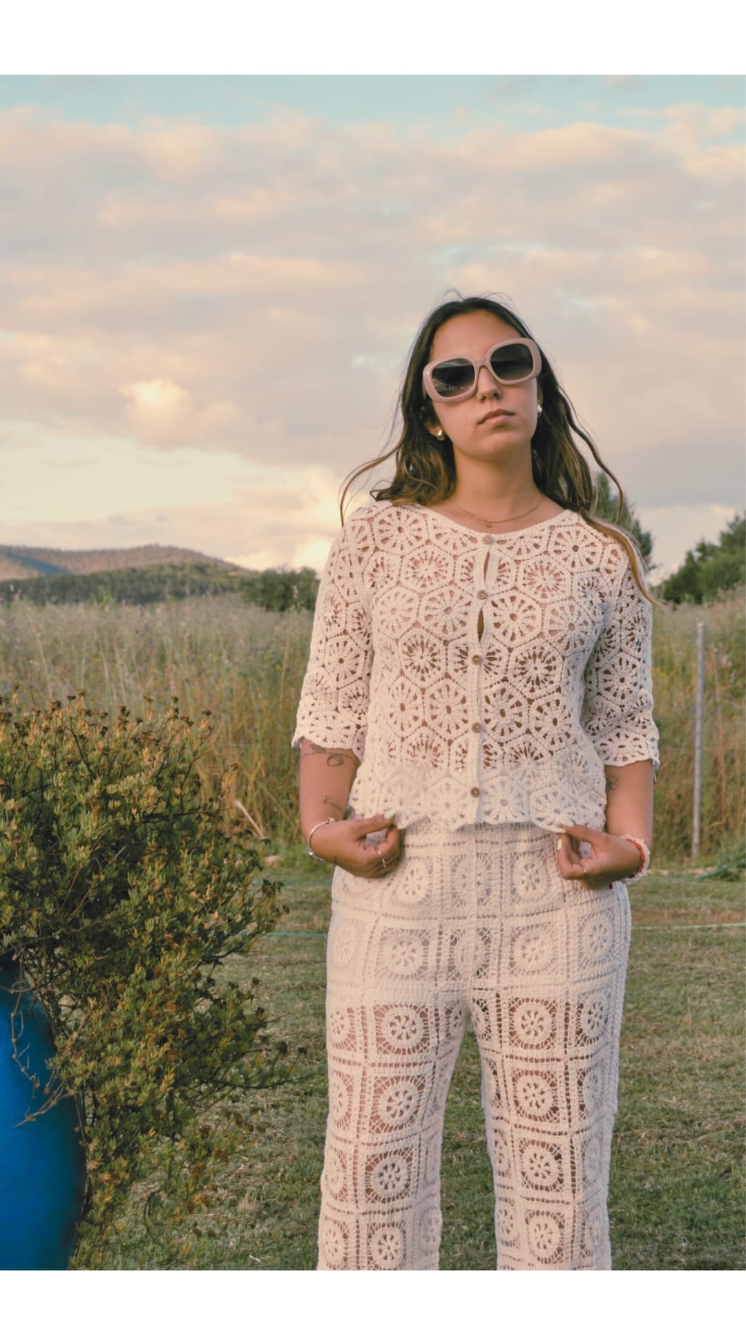 Conjunto de crochet compuesto de pantalón y chaquetilla/top con original diseño. Talla única. Tejido: 80% Algodón.