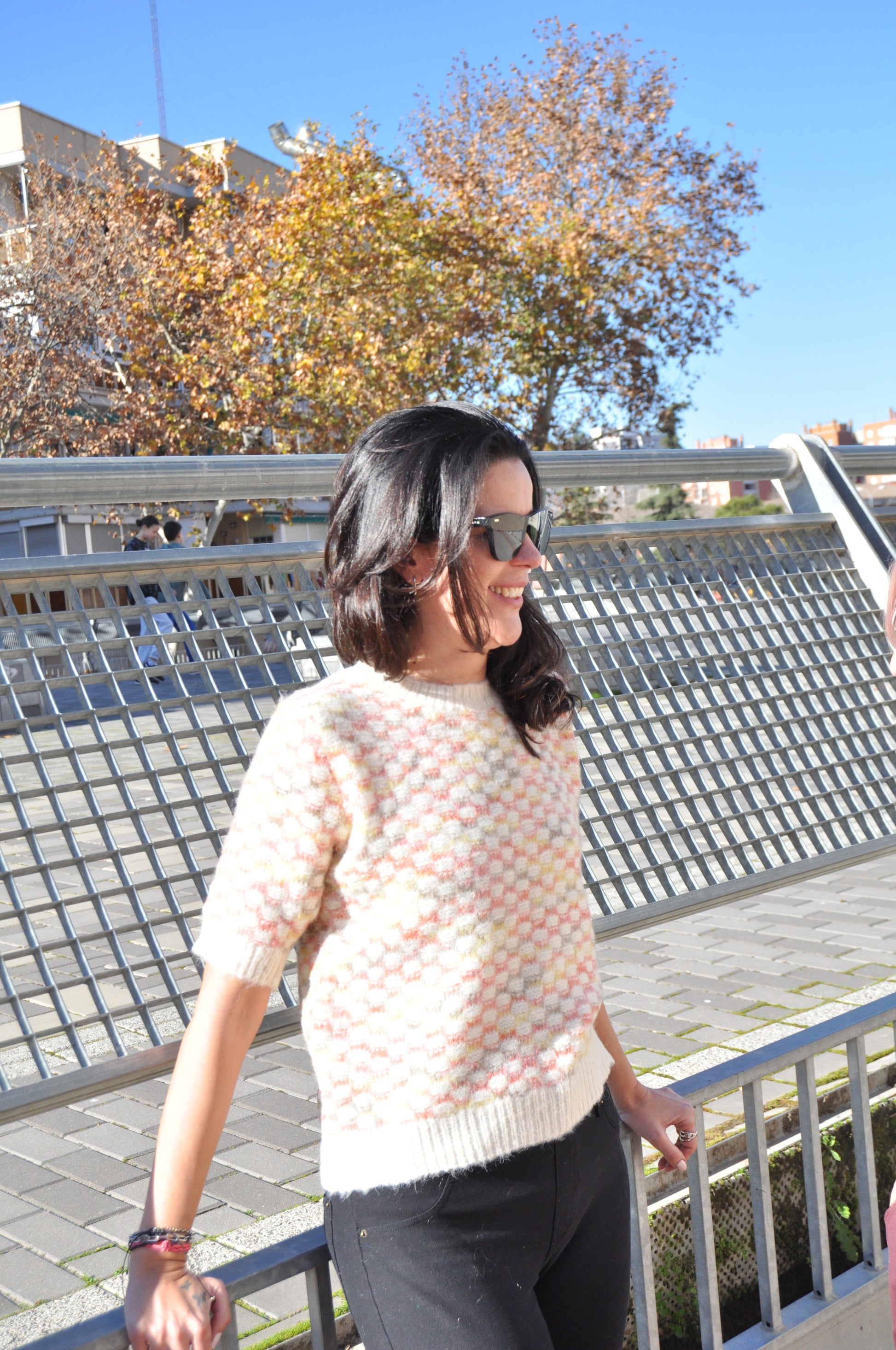 Jersey de punto de manga corta con una combinación geométrica de colores cálidos.