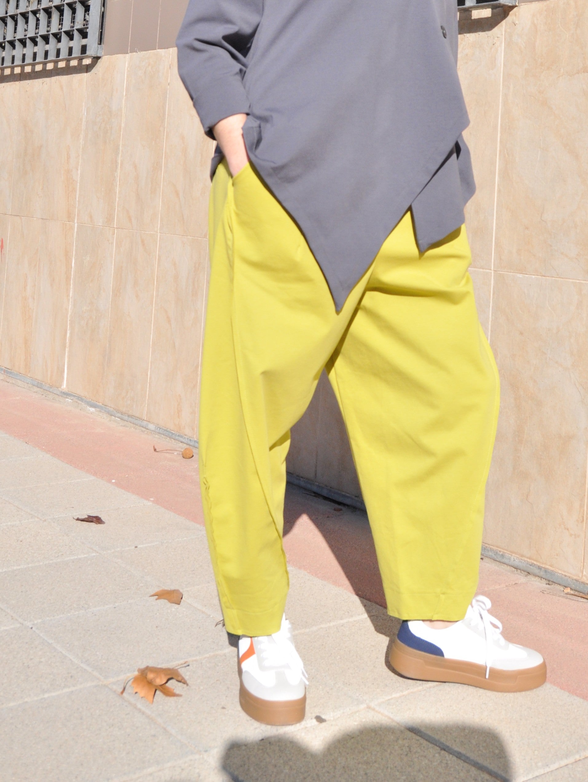 Pantalón baggy confeccionado en un maravilloso tejido de punto roma en color verde lima. Ideal para darle un rollazo a tus outfits. Cintura elástica.