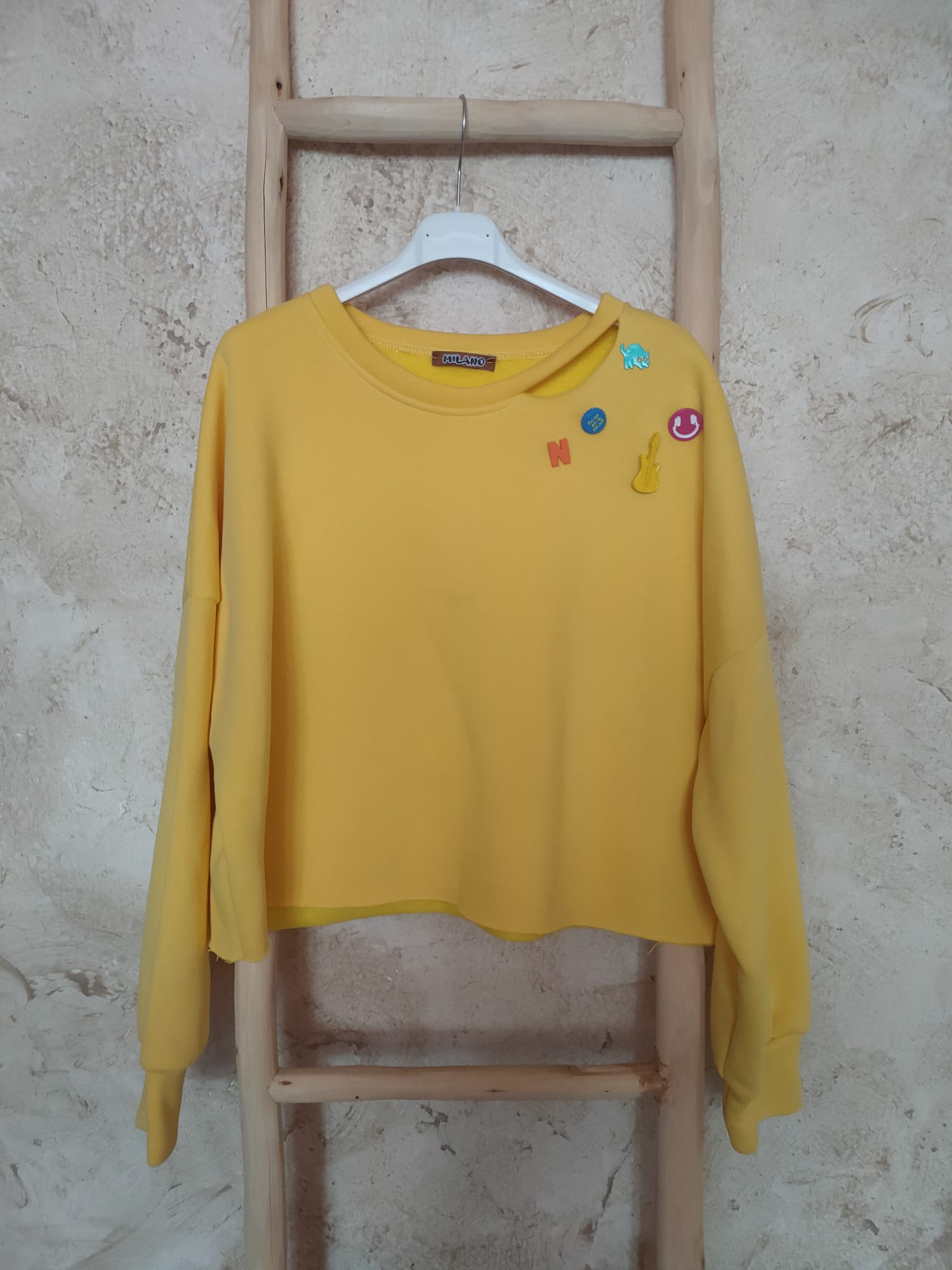 Sudadera en color amarillo con diseño en el escote y detalle de chapas. Talla única. Tejido: 65% Algodón; 35% Poliéster.