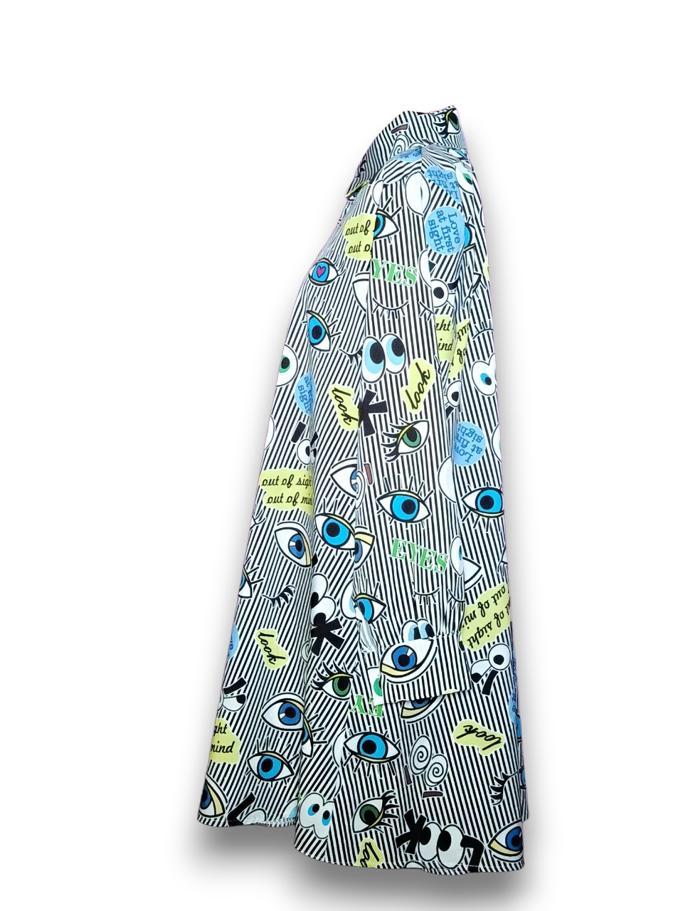 Vestido camisero a rayas con estampado de ojos. Corte evasé/A y bolsillos.